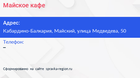 Майское, кафе по адресу Кабардино-Балкария, Майский, улица Медведева, 50 в дальнейшем Организация, размещена в следующих категориях: