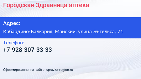 Городская Здравница, аптека по адресу Кабардино-Балкария, Майский, улица Энгельса, 71 в дальнейшем Организация, размещена в следующих категориях: