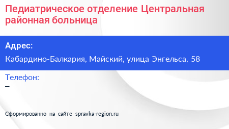 Педиатрическое отделение, Центральная районная больница по адресу Кабардино-Балкария, Майский, улица Энгельса, 58 в дальнейшем Организация, размещена в следующих категориях: