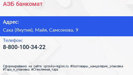 АЭБ, банкомат по адресу Саха (Якутия), Майя, Самсонова, 9 в дальнейшем Организация, размещена в следующих категориях:
