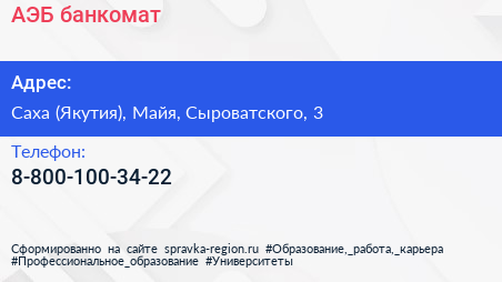 АЭБ, банкомат по адресу Саха (Якутия), Майя, Сыроватского, 3 в дальнейшем Организация, размещена в следующих категориях: