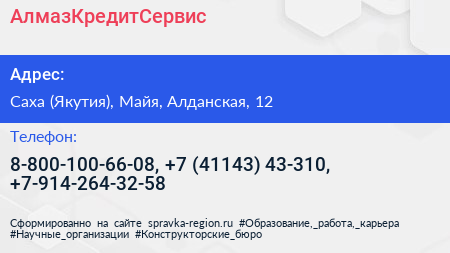 АлмазКредитСервис по адресу Саха (Якутия), Майя, Алданская, 12 в дальнейшем Организация, размещена в следующих категориях: