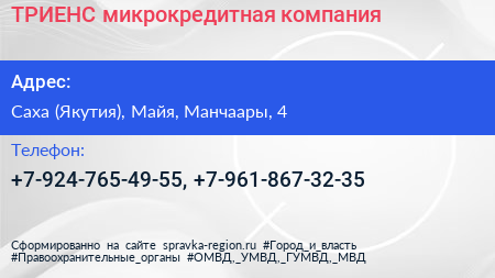 ТРИЕНС, микрокредитная компания по адресу Саха (Якутия), Майя, Манчаары, 4 в дальнейшем Организация, размещена в следующих категориях: