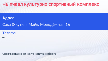 Чыпчаал, культурно-спортивный комплекс по адресу Саха (Якутия), Майя, Молодёжная, 1Б в дальнейшем Организация, размещена в следующих категориях: