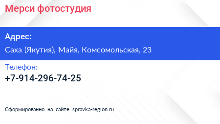 Мерси, фотостудия по адресу Саха (Якутия), Майя, Комсомольская, 23 в дальнейшем Организация, размещена в следующих категориях: