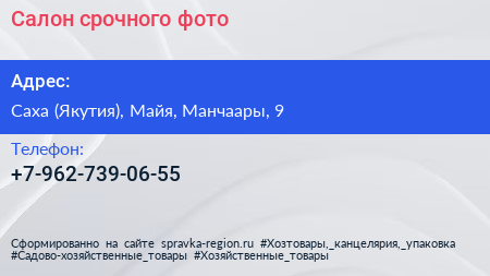 Салон срочного фото по адресу Саха (Якутия), Майя, Манчаары, 9 в дальнейшем Организация, размещена в следующих категориях: