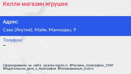 Келли, магазин игрушек по адресу Саха (Якутия), Майя, Манчаары, 9 в дальнейшем Организация, размещена в следующих категориях: