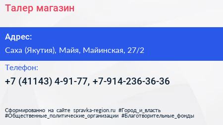 Талер, магазин по адресу Саха (Якутия), Майя, Майинская, 27/2 в дальнейшем Организация, размещена в следующих категориях: