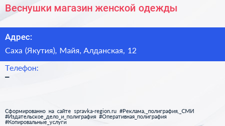 Веснушки, магазин женской одежды по адресу Саха (Якутия), Майя, Алданская, 12 в дальнейшем Организация, размещена в следующих категориях:
