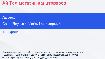 Ай-Тал, магазин канцтоваров по адресу Саха (Якутия), Майя, Манчаары, 4 в дальнейшем Организация, размещена в следующих категориях: