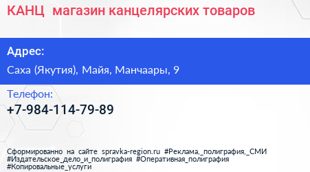 КАНЦ+, магазин канцелярских товаров по адресу Саха (Якутия), Майя, Манчаары, 9 в дальнейшем Организация, размещена в следующих категориях: