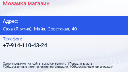 Мозаика, магазин по адресу Саха (Якутия), Майя, Советская, 40 в дальнейшем Организация, размещена в следующих категориях: