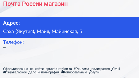Почта России, магазин по адресу Саха (Якутия), Майя, Майинская, 5 в дальнейшем Организация, размещена в следующих категориях: