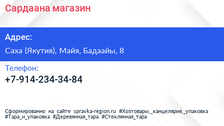 Сардаана, магазин по адресу Саха (Якутия), Майя, Бадаайы, 8 в дальнейшем Организация, размещена в следующих категориях: