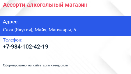 Ассорти, алкогольный магазин по адресу Саха (Якутия), Майя, Манчаары, 6 в дальнейшем Организация, размещена в следующих категориях: