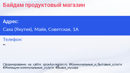 Байдам, продуктовый магазин по адресу Саха (Якутия), Майя, Советская, 1А в дальнейшем Организация, размещена в следующих категориях: