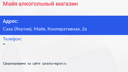 Майя, алкогольный магазин по адресу Саха (Якутия), Майя, Кооперативная, 2а в дальнейшем Организация, размещена в следующих категориях:
