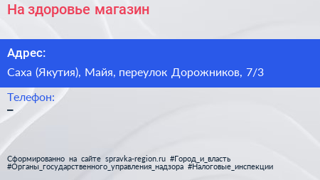 На здоровье, магазин по адресу Саха (Якутия), Майя, переулок Дорожников, 7/3 в дальнейшем Организация, размещена в следующих категориях: