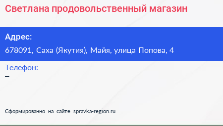 Светлана, продовольственный магазин по адресу 678091, Саха (Якутия), Майя, улица Попова, 4 в дальнейшем Организация, размещена в следующих категориях: