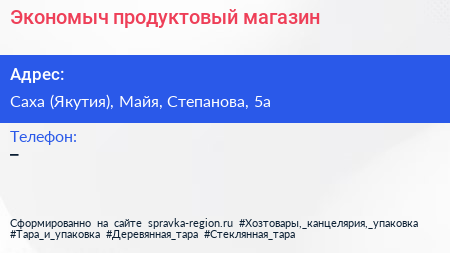 Экономыч, продуктовый магазин по адресу Саха (Якутия), Майя, Степанова, 5а в дальнейшем Организация, размещена в следующих категориях: