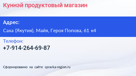 Куннэй, продуктовый магазин по адресу Саха (Якутия), Майя, Героя Попова, 61 к4 в дальнейшем Организация, размещена в следующих категориях: