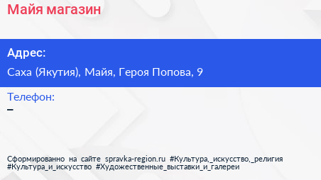 Майя, магазин по адресу Саха (Якутия), Майя, Героя Попова, 9 в дальнейшем Организация, размещена в следующих категориях: