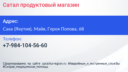 Сатал, продуктовый магазин по адресу Саха (Якутия), Майя, Героя Попова, 68 в дальнейшем Организация, размещена в следующих категориях: