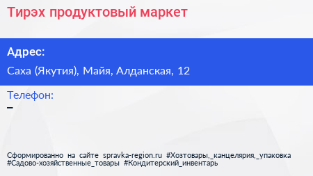 Тирэх, продуктовый маркет по адресу Саха (Якутия), Майя, Алданская, 12 в дальнейшем Организация, размещена в следующих категориях: