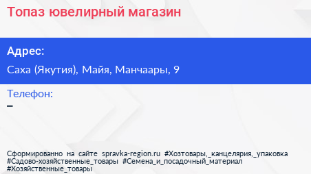 Топаз, ювелирный магазин по адресу Саха (Якутия), Майя, Манчаары, 9 в дальнейшем Организация, размещена в следующих категориях: