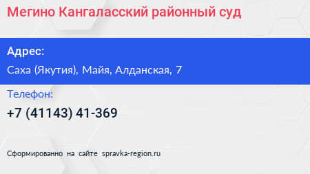 Мегино-Кангаласский районный суд по адресу Саха (Якутия), Майя, Алданская, 7 в дальнейшем Организация, размещена в следующих категориях: