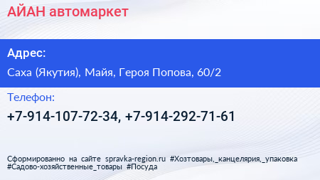 АЙАН, автомаркет по адресу Саха (Якутия), Майя, Героя Попова, 60/2 в дальнейшем Организация, размещена в следующих категориях: