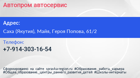 Автопром, автосервис по адресу Саха (Якутия), Майя, Героя Попова, 61/2 в дальнейшем Организация, размещена в следующих категориях: