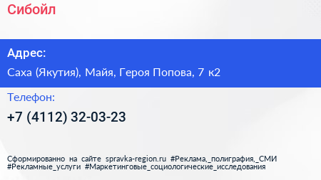 Сибойл по адресу Саха (Якутия), Майя, Героя Попова, 7 к2 в дальнейшем Организация, размещена в следующих категориях: