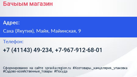 Бачыым, магазин по адресу Саха (Якутия), Майя, Майинская, 9 в дальнейшем Организация, размещена в следующих категориях: