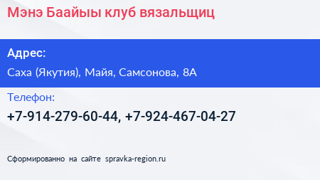 Мэнэ Баайыы, клуб вязальщиц по адресу Саха (Якутия), Майя, Самсонова, 8А в дальнейшем Организация, размещена в следующих категориях: