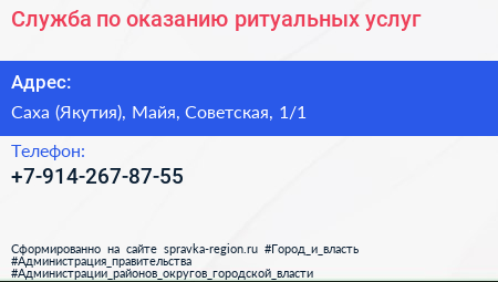 Служба по оказанию ритуальных услуг по адресу Саха (Якутия), Майя, Советская, 1/1 в дальнейшем Организация, размещена в следующих категориях: