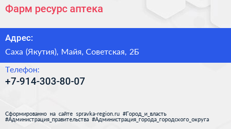 Фарм-ресурс, аптека по адресу Саха (Якутия), Майя, Советская, 2Б в дальнейшем Организация, размещена в следующих категориях: