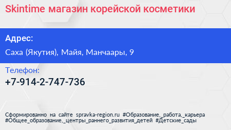 Skintime, магазин корейской косметики по адресу Саха (Якутия), Майя, Манчаары, 9 в дальнейшем Организация, размещена в следующих категориях: