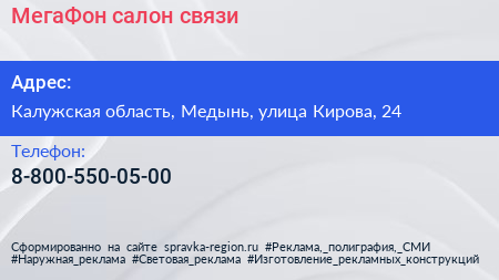 МегаФон, салон связи по адресу Калужская область, Медынь, улица Кирова, 24 в дальнейшем Организация, размещена в следующих категориях:
