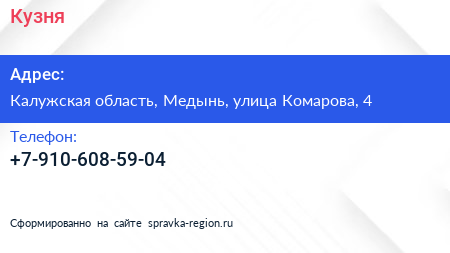 Кузня по адресу Калужская область, Медынь, улица Комарова, 4 в дальнейшем Организация, размещена в следующих категориях: