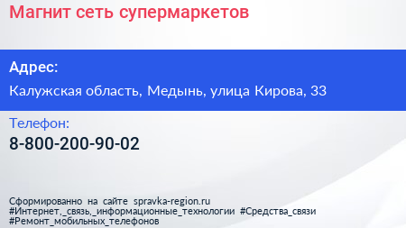 Магнит, сеть супермаркетов по адресу Калужская область, Медынь, улица Кирова, 33 в дальнейшем Организация, размещена в следующих категориях: