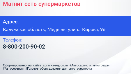 Магнит, сеть супермаркетов по адресу Калужская область, Медынь, улица Кирова, 96 в дальнейшем Организация, размещена в следующих категориях: