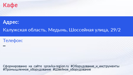 Кафе по адресу Калужская область, Медынь, Шоссейная улица, 29/2 в дальнейшем Организация, размещена в следующих категориях: