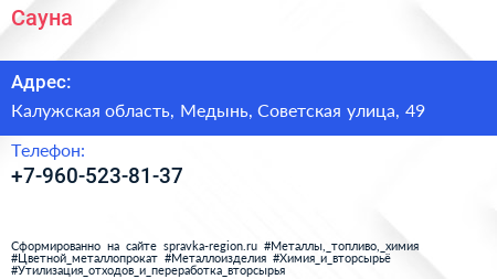 Сауна по адресу Калужская область, Медынь, Советская улица, 49 в дальнейшем Организация, размещена в следующих категориях: