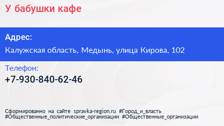 У бабушки, кафе по адресу Калужская область, Медынь, улица Кирова, 102 в дальнейшем Организация, размещена в следующих категориях:
