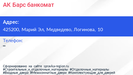 АК Барс, банкомат по адресу 425200, Марий Эл, Медведево, Логинова, 10 в дальнейшем Организация, размещена в следующих категориях: