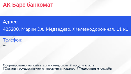 АК Барс, банкомат по адресу 425200, Марий Эл, Медведево, Железнодорожная, 11 к1 в дальнейшем Организация, размещена в следующих категориях: