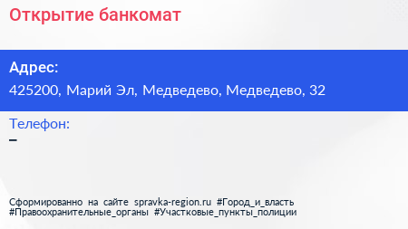 Открытие, банкомат по адресу 425200, Марий Эл, Медведево, Медведево, 32 в дальнейшем Организация, размещена в следующих категориях: