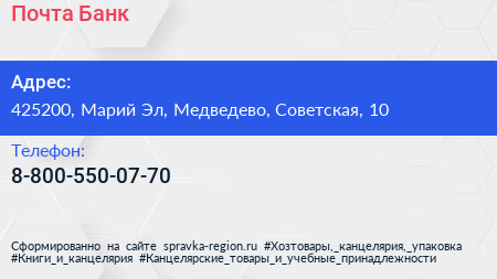 Почта Банк по адресу 425200, Марий Эл, Медведево, Советская, 10 в дальнейшем Организация, размещена в следующих категориях: