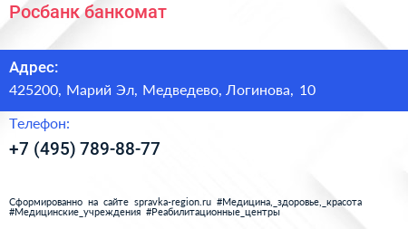 Росбанк, банкомат по адресу 425200, Марий Эл, Медведево, Логинова, 10 в дальнейшем Организация, размещена в следующих категориях: